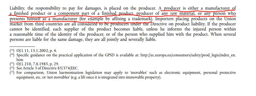 其实听到这个答案后很多跨境电商并不满意,会说,为什么有时候亚马逊要求我(店铺)进行注册呢?这就涉及到欧盟法律一个重要的概念“生产商”。德国欧通Prolinx查阅了欧盟委员会2016年发布的Blue Guide,其中第14页明确给“生产商”做了定义:生产商有两种情况:第一种好理解,就是自己生产产品,并且以自己的名义和品牌上市。第二张情况是自己不生产产品,从其他工厂拿货,但是对外表现为生产商(比如包装/产品上打自己的品牌,公司名称和地址等)属于这种情况最典型的例子就是苹果公司,虽然iphone是富士康生产的,但是在欧盟法规下iphone的“生产商”仍然是苹果。原文请见下面的截图: