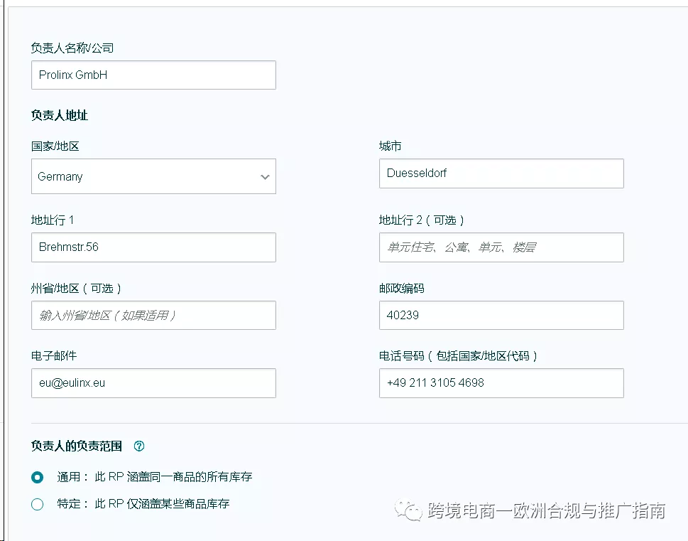 还需要注意的是,只要你的产品需要打CE标识,那么一定需要找这么一个欧盟授权代表。去哪里找呢?来找我们吧,德国欧通Prolinx是这方面专业的一手服务商,1年收费1999元,3年收费4299元,2个工作日办理完成。最近亚马逊在后台会给卖家开case,强制要求卖家提交欧代/合规负责人的信息,下面的截图就是找我们德国欧通Prolinx做欧代后填写的模板: