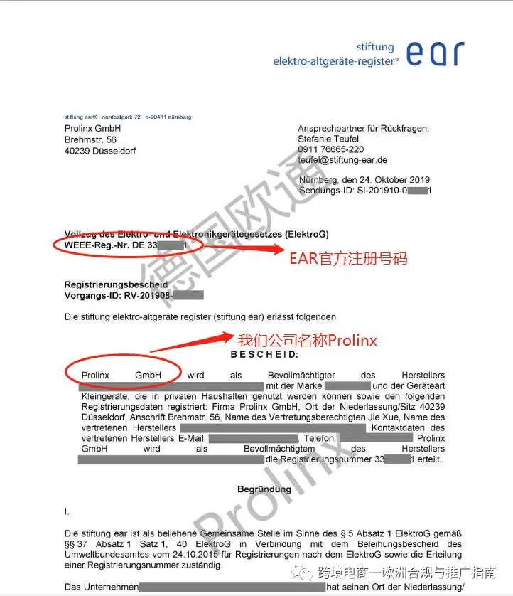 德国欧通Prolinx是德国EAR官方认可的一手注册代理和回收商,我们为您免费提供WEEE注册相关要求、产品分类、申请材料的准备等方面的解答。我们WEEE收费是8388元,这个费用包括了WEEE注册(德国官方EAR收费)、申报、代理、保险和注销费用,这个费用甚至还包括了25吨以内的回收处理费用。下图是我们德国欧通在德国ear官方办理的WEEE证书样本: